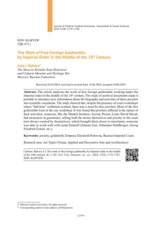 Библиографическое описание:Быкова, Ю. И. Работа вольных иностранных золотых дел мастеров по императорскому заказу в середине XVIII века = The Work of Free Foreign Goldsmiths by Imperial Order in the Middle of the 18th Century / Ю. И. Быкова. - Текст : непосредственный // Журнал Сибирского федерального университета. Гуманитарные науки. - 2024. - Т. 17, № 9. - С. 1774-1781. - Библиогр.: с. 1780-1781. - ISSN 1997-1370.