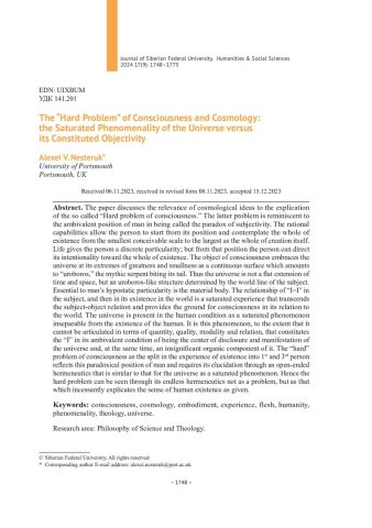 Библиографическое описание:Nesteruk, Alexei. The "Hard Problem" of Consciousness and Cosmology: the Saturated Phenomenality of the Universe versus its Constituted Objectivity = "Трудная проблема сознания" и космология: насыщенная феноменальность вселенной versus, ее конституированная объективность / A. V. Nesteruk. - Текст : непосредственный // Журнал Сибирского федерального университета. Гуманитарные науки. - 2024. - Т. 17, № 9. - С. 1748-1773. - Библиогр.: с. 1772-1773. - ISSN 1997-1370.
