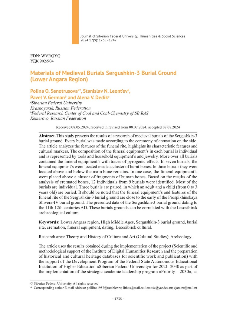 Библиографическое описание:Материалы средневековых погребений стоянки-могильника Сергушкин-3 (Нижнее Приангарье) = Materials of Medieval Burials Sergushkin-3 Burial Ground (Lower Angara Region) / П. О. Сенотрусова, С. Н. Леонтьев, П. В. Герман, А. В. Дедик. - Текст : непосредственный // Журнал Сибирского федерального университета. Гуманитарные науки. - 2024. - Т. 17, № 9. - С. 1735-1747. - Библиогр.: с. 1745-1747. - ISSN 1997-1370.
