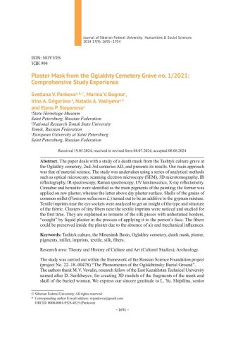 Библиографическое описание:Гипсовая маска из погребения 1/2021 Оглахтинского могильника: опыт комплексного изучения = Plaster Mask from the Oglakhty Cemetery Grave no. 1/2021: Comprehensive Study Experience / C. В. Панкова, М. В. Богма, И. А. Григорьева [и др.]. - Текст : непосредственный // Журнал Сибирского федерального университета. Гуманитарные науки. - 2024. - Т. 17, № 9. - С. 1691-1704. - Библиогр.: с. 1703-1704. - ISSN 1997-1370.