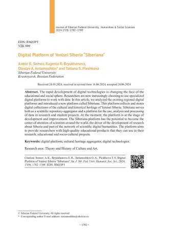 Библиографическое описание:Цифровая платформа Енисейской Сибири "Сибириана" = Digital Platform of Yenisei Siberia "Siberiana" / А. К. Сомов, Е. Р. Брюханова, О. А. Антамошкин, Т. С. Плешкова. - Текст : непосредственный // Журнал Сибирского федерального университета. Гуманитарные науки. - 2024. - Т. 17, № 9. - С. 1782-1789. - Библиогр.: с. 1789. - ISSN 1997-1370.