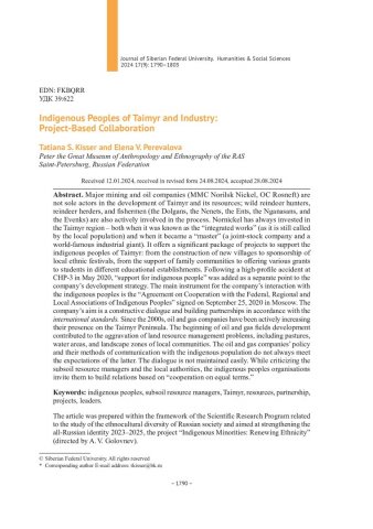 Библиографическое описание:Kisser, Tatiana. Indigenous Peoples of Taimyr and Industry: Project-Based Collaboration = Коренные народы Таймыра и промышленники: проектное взаимодействие / T. S. Kisser, E. V. Perevalova. - Текст : непосредственный // Журнал Сибирского федерального университета. Гуманитарные науки. - 2024. - Т. 17, № 9. - С. 1790-1803. - Библиогр.: с. 1803. - ISSN 1997-1370.