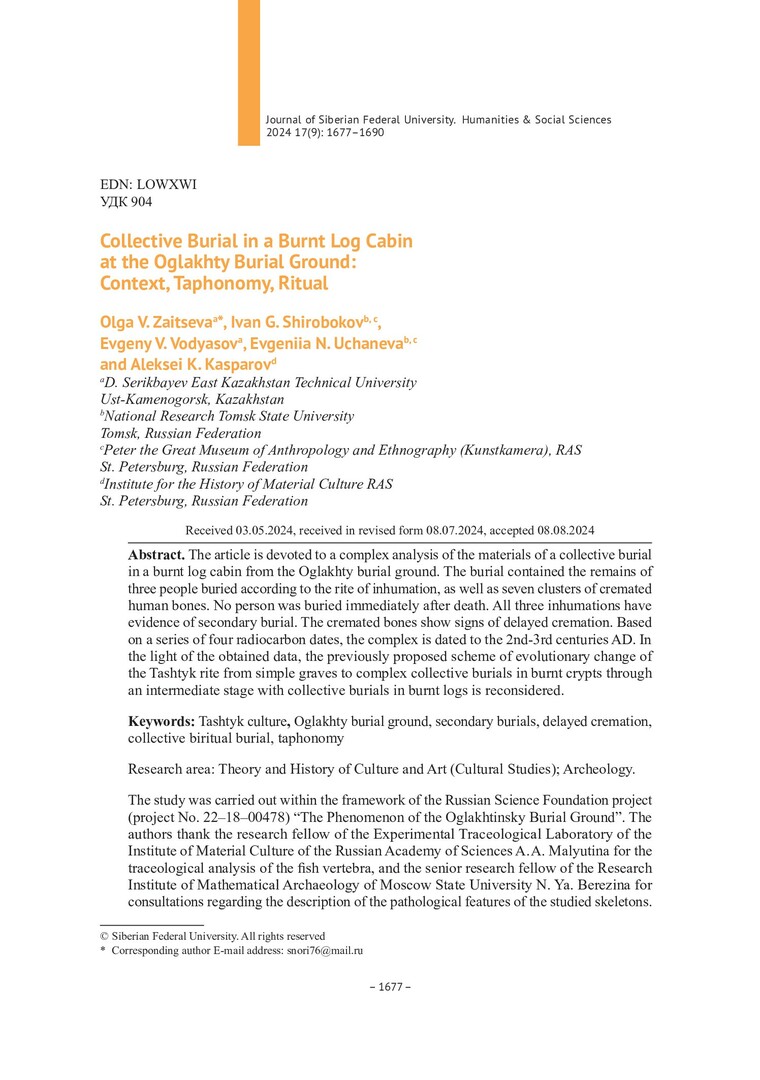 Библиографическое описание:Коллективное погребение в сожженном срубе на Оглахтинском могильнике: контекст, тафономия, ритуал = Collective Burial in a Burnt Log Cabin at the Oglakhty Burial Ground: Context, Taphonomy, Ritual / О. В. Зайцева, И. Г. Широбоков, Е. В. Водясов [и др.]. - Текст : непосредственный // Журнал Сибирского федерального университета. Гуманитарные науки. - 2024. - Т. 17, № 9. - С. 1677-1690. - Библиогр.: с. 1689-1690. - ISSN 1997-1370.