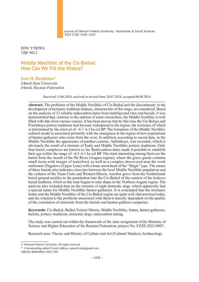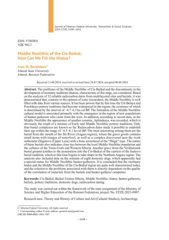 Библиографическое описание:Бердников, И. М. Средний неолит Предбайкалья: чем нам наполнить хиатус? = Middle Neolithic of the Cis-Baikal: How Can We Fill the Hiatus? / И. М. Бердников. - Текст : непосредственный // Журнал Сибирского федерального университета. Гуманитарные науки. - 2024. - Т. 17, № 9. - С. 1638-1651. - Библиогр.: с. 1649-1651. - ISSN 1997-1370.