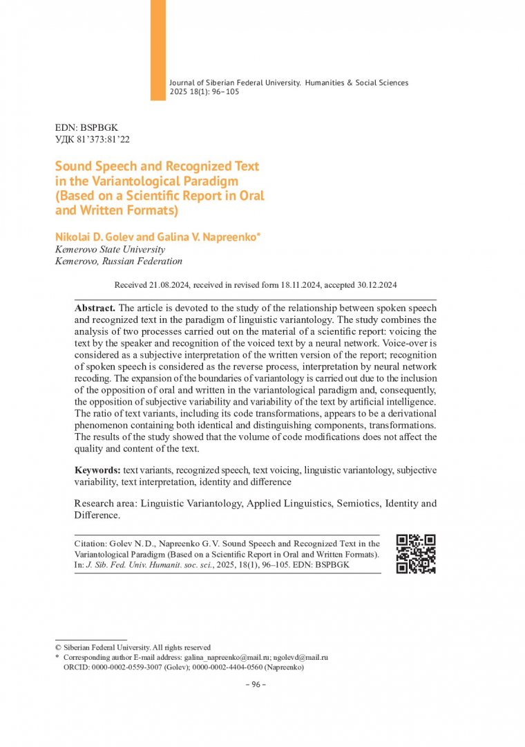 Библиографическое описание:Голев, Н. Д. Звучащая речь и распознанный текст в вариантологической парадигме (на материале научного доклада в устном и письменном форматах) = Sound Speech and Recognized Text in the Variantological Paradigm (Based on a Scientific Report in Oral and Written Formats) / Н. Д. Голев, Г. В. Напреенко. - Текст : непосредственный // Журнал Сибирского федерального университета. Гуманитарные науки. - 2025. - Т. 18, № 1. - С. 96-105. - Библиогр.: с. 104-105. - ISSN 1997-1370.