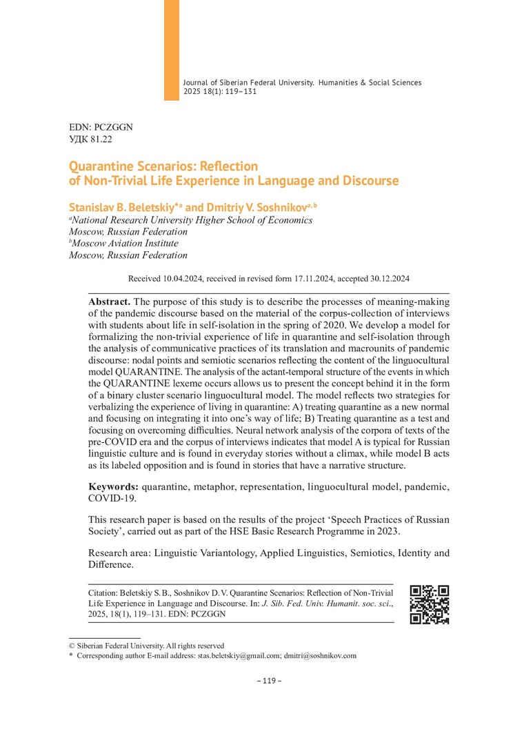 Библиографическое описание:Белецкий, С. Б. Сценарии карантина: отражение нетривиального жизненного опыта в языке и дискурсе = Quarantine Scenarios: Reflection of Non-Trivial Life Experience in Language and Discourse / С. Б. Белецкий, Д. В. Сошников. - Текст : непосредственный // Журнал Сибирского федерального университета. Гуманитарные науки. - 2025. - Т. 18, № 1. - С. 119-131. - Библиогр.: с. 130-131. - ISSN 1997-1370.