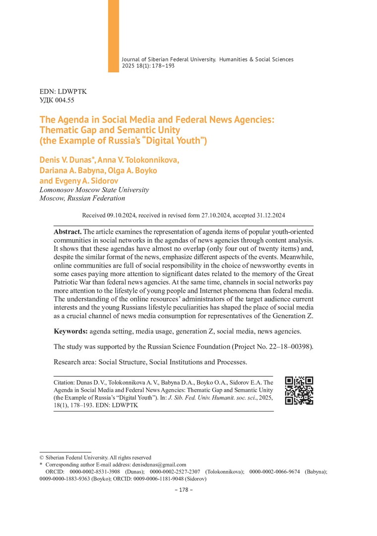 Библиографическое описание:Повестка дня в социальных медиа и федеральных информагентствах: тематический разрыв и смысловое единство (на примере "цифровой молодежи" России) = The Agenda in Social Media and Federal News Agencies: Thematic Gap and Semantic Unity (the Example of Russia’s "Digital Youth") / Д. В. Дунас, А. В. Толоконникова, Д. А. Бабына [и др.]. - Текст : непосредственный // Журнал Сибирского федерального университета. Гуманитарные науки. - 2025. - Т. 18, № 1. - С. 178-193. - Библиогр.: с. 191-193. - ISSN 1997-1370.