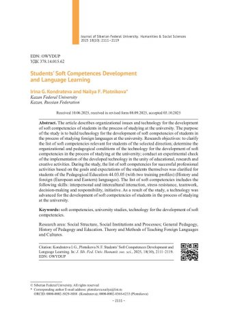 Библиографическое описание:Кондратьева, И. Г. Развитие гибких компетенций студентов в процессе обучения иностранным языкам = Students` Soft Competences Development and Language Learning / И. Г. Кондратьева, Н. Ф. Плотникова. - Текст : непосредственный // Журнал Сибирского федерального университета. Гуманитарные науки. - 2025. - Т. 18, № 10. - С. 2111-2119. - Библиогр.: с. 2118-2119. - ISSN 1997-1370.