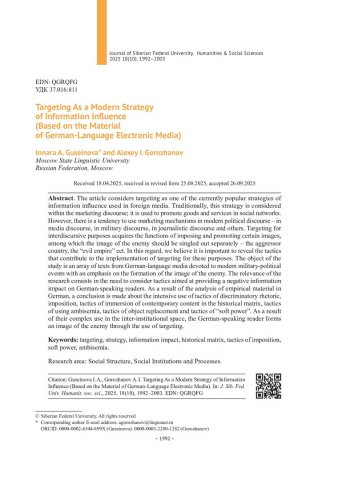 Библиографическое описание:Гусейнова, И. А. Таргетинг как современная стратегия информационного воздействия (на материале немецкоязычных электронных СМИ) = Targeting As a Modern Strategy of Information Influence (Based on the Material of German- Language Electronic Media) / И. А. Гусейнова, А. И. Горожанов. - Текст : непосредственный // Журнал Сибирского федерального университета. Гуманитарные науки. - 2025. - Т. 18, № 10. - С. 1992-2003. - Библиогр.: с. 2002-2003. - ISSN 1997-1370.