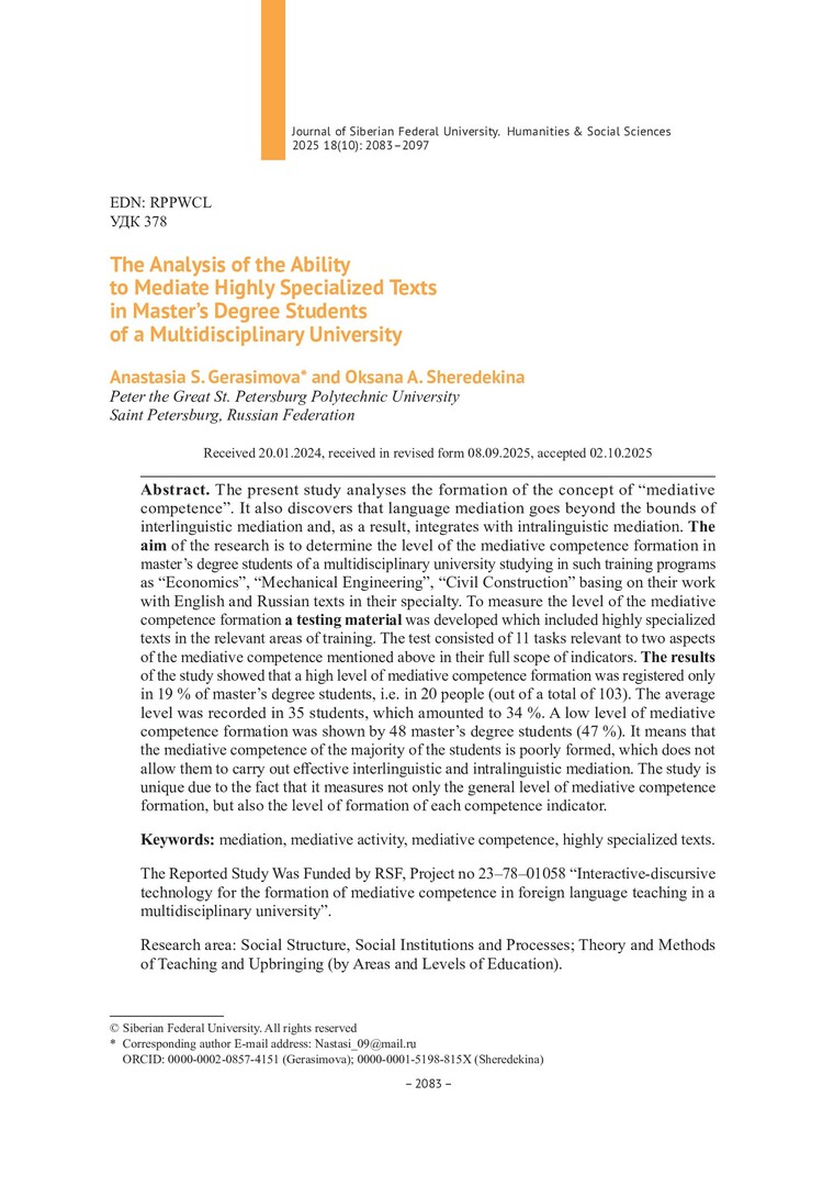 Библиографическое описание:Герасимова, А. С. Анализ способности магистрантов многопрофильного вуза к медиации узкоспециальных текстов = The Analysis of the Ability to Mediate Highly Specialized Texts in Master`s Degree Students of a Multidisciplinary University / А. С. Герасимова, О. А. Шередекина. - Текст : непосредственный // Журнал Сибирского федерального университета. Гуманитарные науки. - 2025. - Т. 18, № 10. - С. 2083-2097. - Библиогр.: с. 2095-2097. - ISSN 1997-1370.
