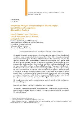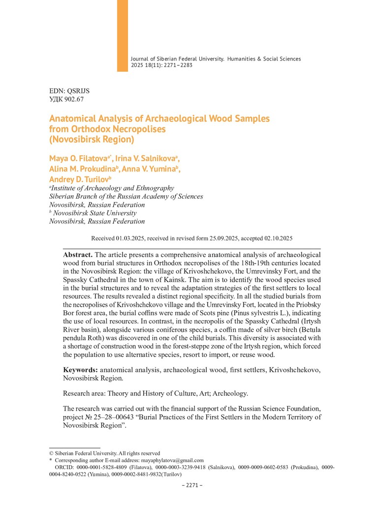 Библиографическое описание:Анатомический анализ образцов археологической древесины из православных некрополей (Новосибирская область) = Anatomical Analysis of Archaeological Wood Samples from Orthodox Necropolises (Novosibirsk Region) / М. О. Филатова, И. В. Сальников, А. М. Прокудина [и др.]. - Текст : непосредственный // Журнал Сибирского федерального университета. Гуманитарные науки. - 2025. - Т. 18, № 11. - С. 2271-2283. - Библиогр.: с. 2281-2283. - ISSN 1997-1370.