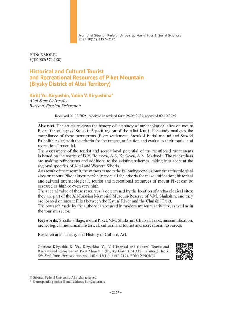 Библиографическое описание:Кирюшин, К. Ю. Историко-культурные туристско-рекреационные ресурсы г. Пикет (Бийский район Алтайского края) = Historical and Cultural Tourist and Recreational Resources of Piket Mountain (Biysky District of Altai Territory) / К. Ю. Кирюшин, Ю. В. Кирюшина. - Текст : непосредственный // Журнал Сибирского федерального университета. Гуманитарные науки. - 2025. - Т. 18, № 11. - С. 2157-2171. - Библиогр.: с. 2170-2171. - ISSN 1997-1370.