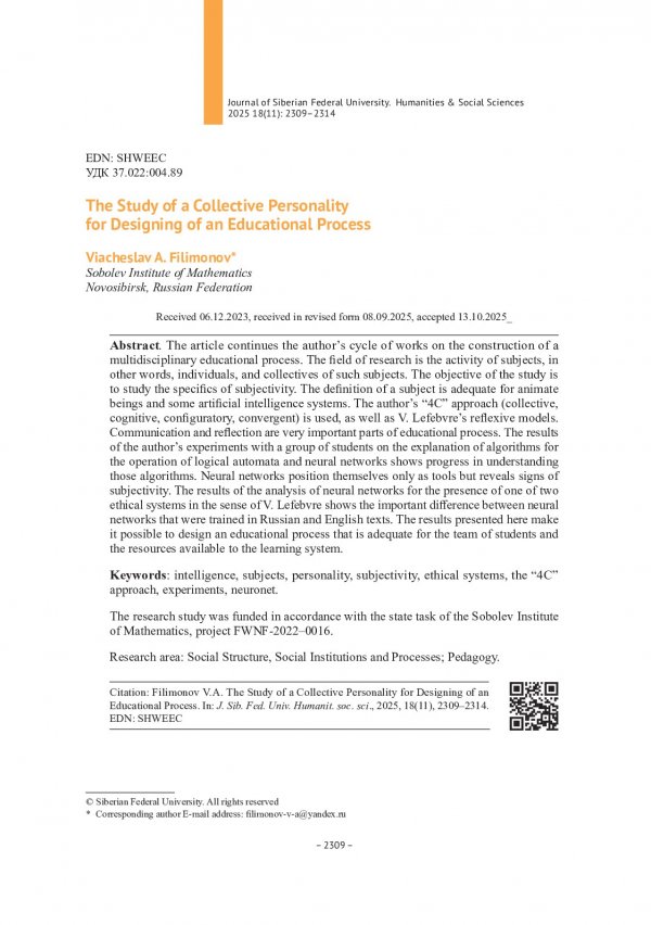 Библиографическое описание:Filimonov, Viacheslav. The Study of a Collective Personality for Designing of an Educational Process = Исследование коллективного субъекта для конструирования образовательного процесса / V. A. Filimonov. - Текст : непосредственный // Журнал Сибирского федерального университета. Гуманитарные науки. - 2025. - Т. 18, № 11. - С. 2309-2314. - Библиогр.: с. 2313-2314. - ISSN 1997-1370.