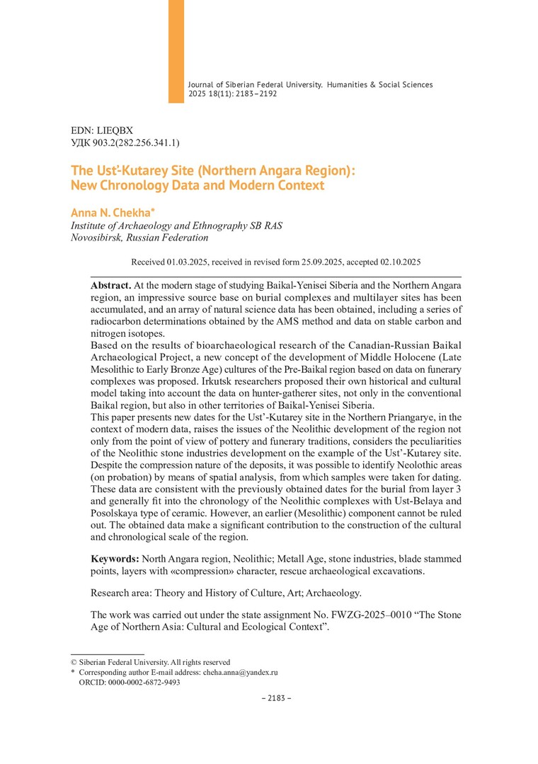 Библиографическое описание:Чеха, А. Н. Стоянка Устье Реки Кутарей (Северное Приангарье): новые данные по хронологии и современный контекст = The Ust`-Kutarey Site (Northern Angara Region): New Chronology Data and Modern Context / А. Н. Чеха. - Текст : непосредственный // Журнал Сибирского федерального университета. Гуманитарные науки. - 2025. - Т. 18, № 11. - С. 2183-2192. - Библиогр.: с. 2191-2192. - ISSN 1997-1370.