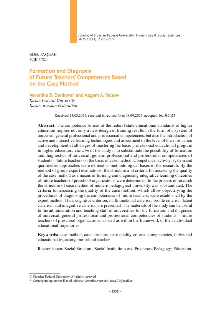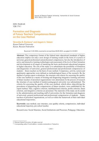 Библиографическое описание:Dankova, Veronika. Formation and Diagnosis of Future Teachers’ Competences Based on the Case Method = Формирование и диагностика компетенций будущих педагогов на основе кейс-метода / V. B. Dankova, A. A. Valeev. - Текст : непосредственный // Журнал Сибирского федерального университета. Гуманитарные науки. - 2025. - Т. 18, № 11. - С. 2353-2369. - Библиогр.: с. 2367-2369. - ISSN 1997-1370.