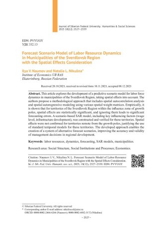 Библиографическое описание:Наумов, И. В. Прогнозная сценарная модель динамики трудовых ресурсов в муниципальных образованиях Свердловской области с учетом пространственных эффектов = Forecast Scenario Model of Labor Resource Dynamics in Municipalities of the Sverdlovsk Region with the Spatial Effects Consideration / И. В. Наумов, Н. Л. Никулина. - Текст : непосредственный // Журнал Сибирского федерального университета. Гуманитарные науки. - 2025. - Т. 18, № 12. - С. 2527-2539. - Библиогр.: с. 2538-2539. - ISSN 1997-1370.
