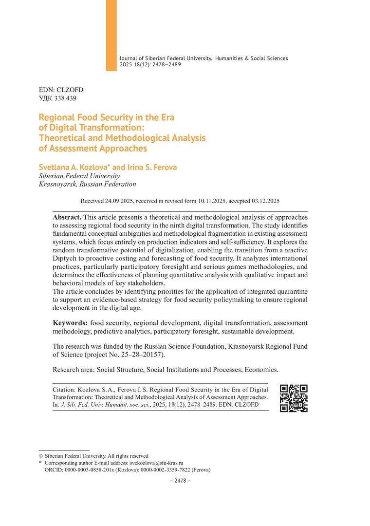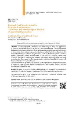Библиографическое описание:Козлова, С. А. Продовольственная безопасность региона в эпоху цифровой трансформации: теоретико- методический анализ подходов к оценке = Regional Food Security in the Era of Digital Transformation: Theoretical and Methodological Analysis of Assessment Approaches / С. А. Козлова, И. С. Ферова. - Текст : непосредственный // Журнал Сибирского федерального университета. Гуманитарные науки. - 2025. - Т. 18, № 12. - С. 2478-2489. - Библиогр.: с. 2488-2489. - ISSN 1997-1370.
