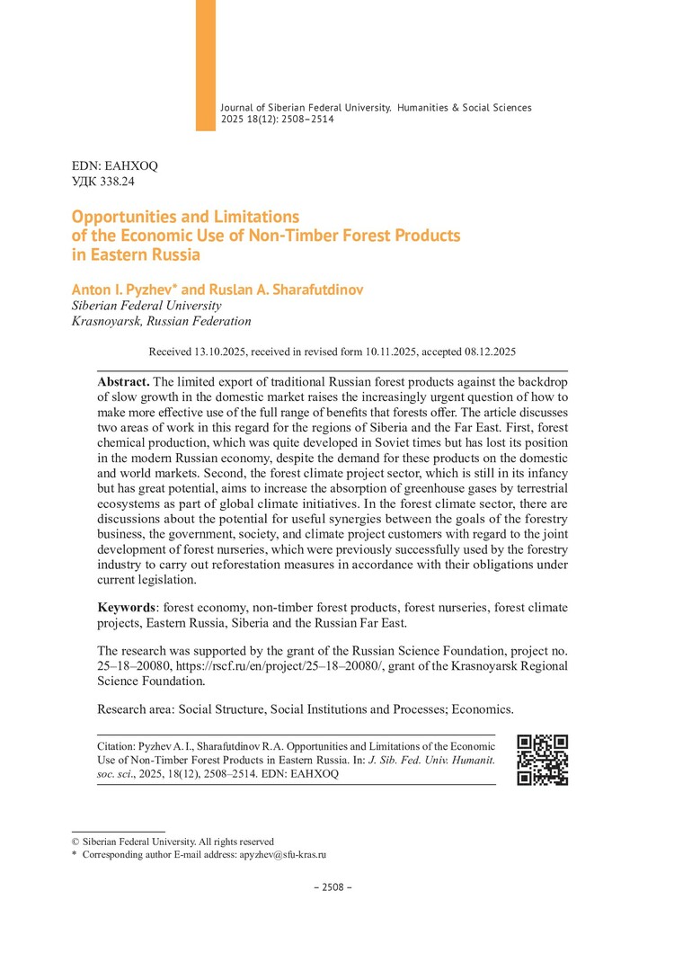 Библиографическое описание:Пыжев, А. И. Возможности и ограничения хозяйственного использования недревесных полезностей лесов Востока России = Opportunities and Limitations of the Economic Use of Non-Timber Forest Products in Eastern Russia / А. И. Пыжев, Р. А. Шарафутдинов. - Текст : непосредственный // Журнал Сибирского федерального университета. Гуманитарные науки. - 2025. - Т. 18, № 12. - С. 2508-2514. - Библиогр.: с. 2513-2514. - ISSN 1997-1370.
