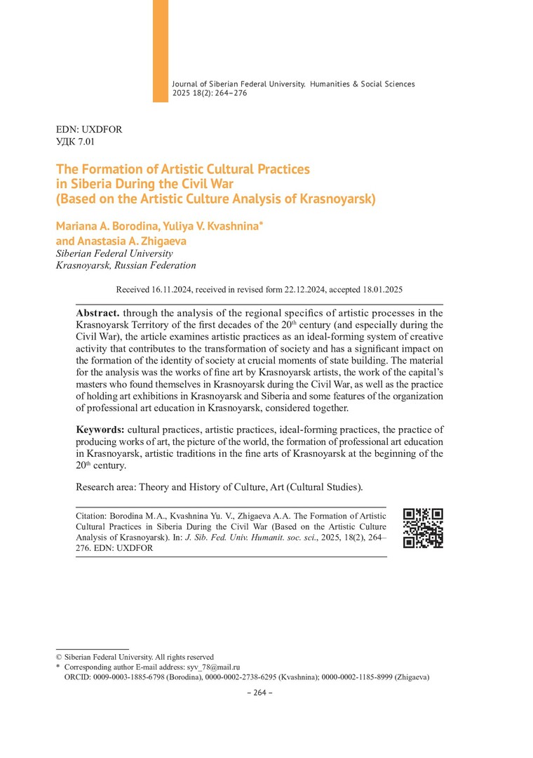 Библиографическое описание:Бородина, М. А. Становление художественных культурных практик в Сибири в годы Гражданской войны (на материале анализа художественной культуры Красноярска) = The Formation of Artistic Cultural Practices in Siberia During the Civil War (Based on the Artistic Culture Analysis of Krasnoyarsk) / М. А. Бородина, Ю. В. Квашнина, А. А. Жигаева. - Текст : непосредственный // Журнал Сибирского федерального университета. Гуманитарные науки. - 2025. - Т. 18, № 2. - С. 264-276. - Библиогр.: с. 275-276. - ISSN 1997-1370.