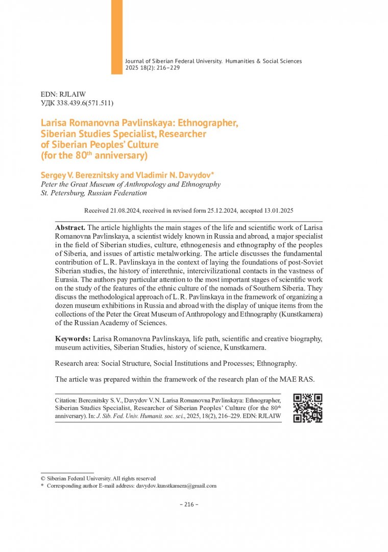 Библиографическое описание:Березницкий, С. В. Лариса Романовна Павлинская: этнограф, сибиревед, исследователь культуры народов Сибири (к 80-летию со дня рождения) = Larisa Romanovna Pavlinskaya: Ethnographer, Siberian Studies Specialist, Researcher of Siberian People`s Culture (for the 80th anniversary) / С. В. Березницкий, В. Н. Давыдов. - Текст : непосредственный // Журнал Сибирского федерального университета. Гуманитарные науки. - 2025. - Т. 18, № 2. - С. 216-229. - Библиогр.: с. 227-229. - ISSN 1997-1370.