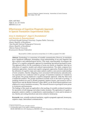 Библиографическое описание:Iskakbayeva, Ainur. Effectiveness of Cognitive-Pragmatic Approach in Special Translation: Experimental Study = Эффективность когнитивно-прагматического подхода в специализированном переводе: экспериментальное исследование / A. A. Iskakbayeva, A. K. Zhumabekova, V. A. Razumovskaya. - Текст : непосредственный // Журнал Сибирского федерального университета. Гуманитарные науки. - 2025. - Т. 18, № 2. - С. 378-389. - Библиогр.: с. 388-389. - ISSN 1997-1370.