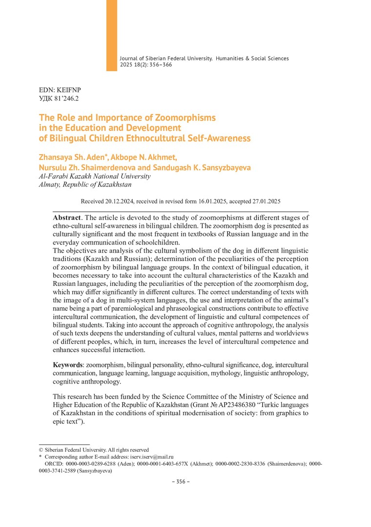 Библиографическое описание:The Role and Importance of Zoomorphisms in the Education and Development of Bilingual Children Ethnocultutral Self-Awareness = Роль и значение зооморфизмов в обучении и развитии этнокультурного самосознания у билингвальных детей / Zhansaya Sh. Aden, A. N. Akhmet, Nursulu Zh. Shaimerdenova, S. K. Sansyzbayeva. - Текст : непосредственный // Журнал Сибирского федерального университета. Гуманитарные науки. - 2025. - Т. 18, № 2. - С. 356-366. - Библиогр.: с. 366. - ISSN 1997-1370.