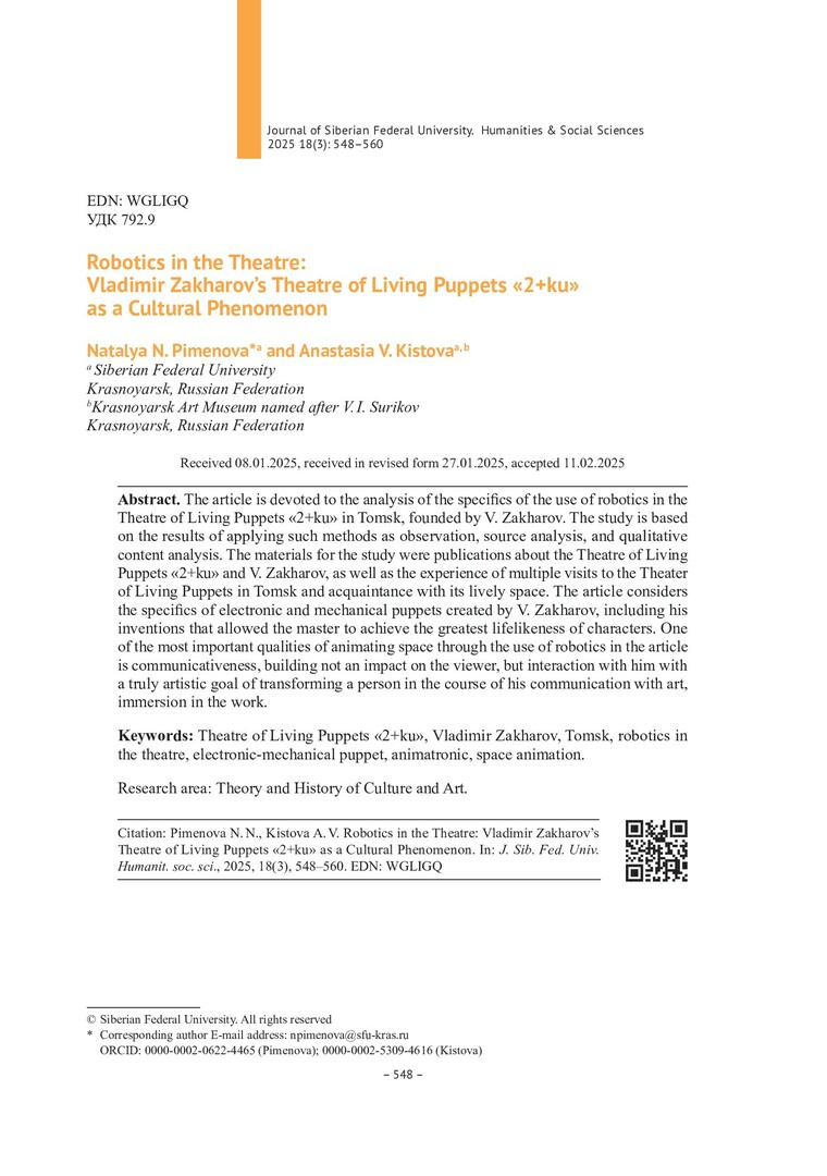 Библиографическое описание:Пименова, Н. Н. Робототехника в театре: Театр живых кукол "2+ку" Владимира Захарова как культурный феномен = Robotics in the Theatre: Vladimir Zakharov`s Theatre of Living Puppets "2+ku" as a Cultural Phenomenon / Н. Н. Пименова, А. В. Кистова. - Текст : непосредственный // Журнал Сибирского федерального университета. Гуманитарные науки. - 2025. - Т. 18, № 3. - С. 548-560. - Библиогр.: с. 559-560. - ISSN 1997-1370.