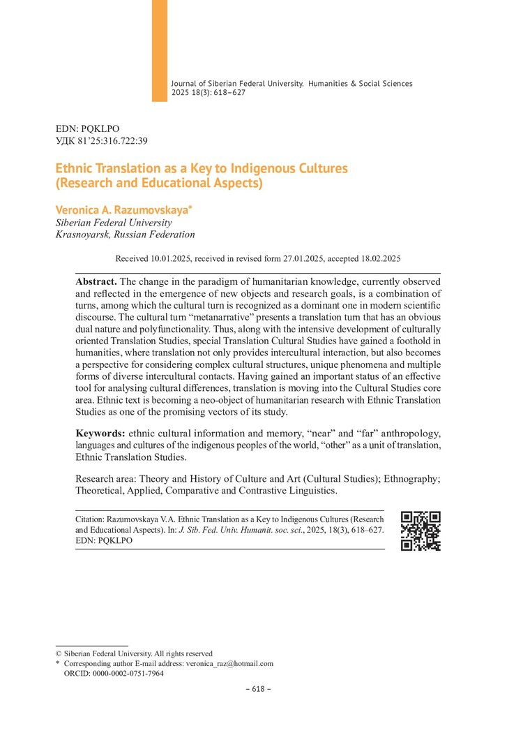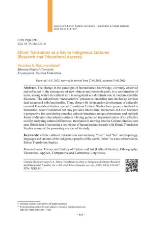 Библиографическое описание:Razumovskaya, Veronica. Ethnic Translation as a Key to Indigenous Cultures (Research and Educational Aspects) = Этноперевод – ключ к культурам коренных народов (исследовательский и образовательный аспекты) / V. A. Razumovskaya. - Текст : непосредственный // Журнал Сибирского федерального университета. Гуманитарные науки. - 2025. - Т. 18, № 3. - С. 618-627. - Библиогр.: с. 626-627. - ISSN 1997-1370.