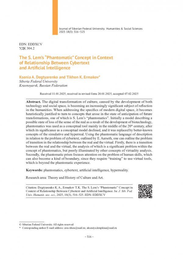 Библиографическое описание:Дегтяренко, К. А. Концепция "фантоматики" С. Лема в контексте соотношений кибертекста и искусственного интеллекта = The S. Lem`s "Phantomatic" Concept in Context of Relationship Between Cybertext and Artificial Intelligence / К. А. Дегтяренко, Т. К. Ермаков. - Текст : непосредственный // Журнал Сибирского федерального университета. Гуманитарные науки. - 2025. - Т. 18, № 3. - С. 516-525. - Библиогр.: с. 524-525. - ISSN 1997-1370.