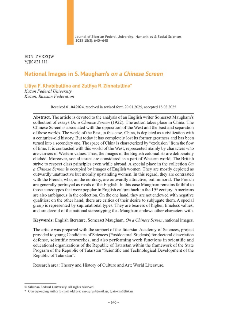 Библиографическое описание:Хабибуллина, Л. Ф. Национальные образы в сборнике эссе С. Моэма "На китайской ширме" = National Images in S. Maugham’s on a Chinese Screen / Л. Ф. Хабибуллина, З. Р. Зиннатуллина. - Текст : непосредственный // Журнал Сибирского федерального университета. Гуманитарные науки. - 2025. - Т. 18, № 3. - С. 640-648. - Библиогр.: с. 648. - ISSN 1997-1370.
