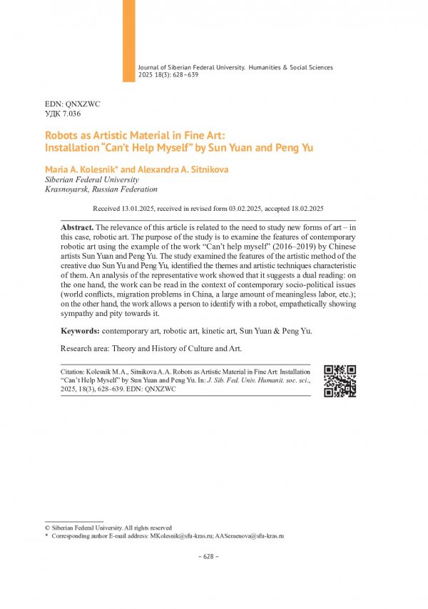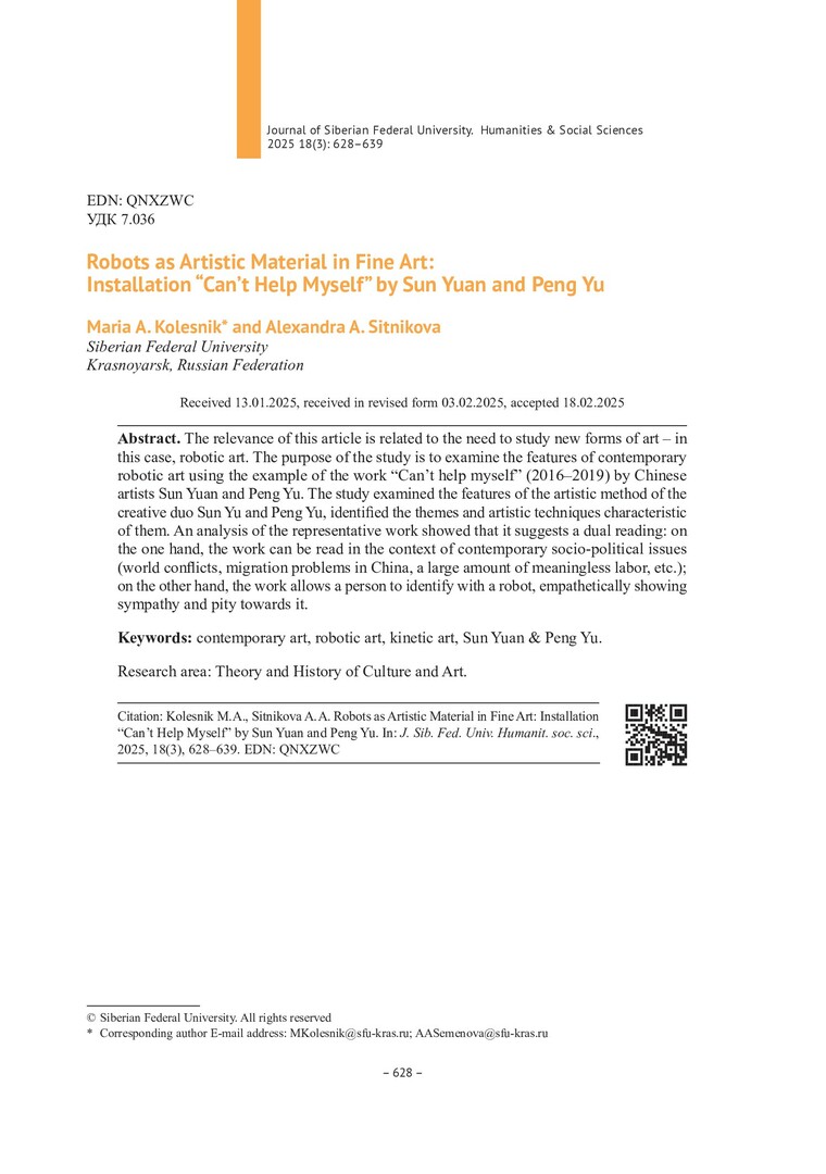 Библиографическое описание:Колесник, М. А. Роботы как художественный материал в изобразительном искусстве: инсталляция "Can`t Help Myself" Сунь Юань и Пэн Ю = Robots as Artistic Material in Fine Art: Installation "Can`t Help Myself" by Sun Yuan and Peng Yu / М. А. Колесник, А. А. Ситникова. - Текст : непосредственный // Журнал Сибирского федерального университета. Гуманитарные науки. - 2025. - Т. 18, № 3. - С. 628-639. - Библиогр.: с. 638-639. - ISSN 1997-1370.