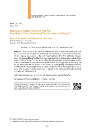 Аннотация:Актуальность настоящей статьи связана с необходимостью изучения новых форм искусства – в данном случае, роботизированного искусства. Цель исследования – изучить особенности современного роботизированного искусства на примере произведения "Can`t help myself" (2016–2019) китайских художников Сунь Юаня и Пэн Ю.