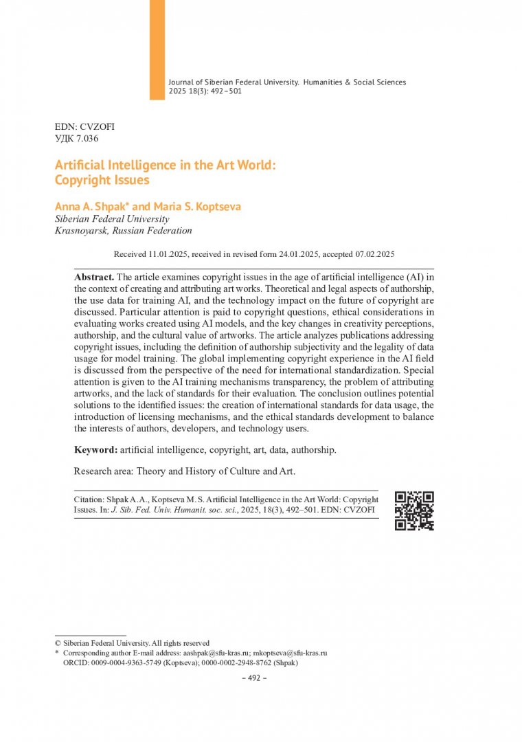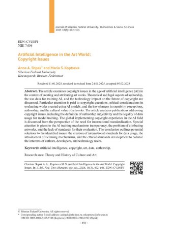 Библиографическое описание:Шпак, А. А. Искусственный интеллект в мире искусства: авторское право = Artificial Intelligence in the Art World: Copyright Issues / А. А. Шпак, М. С. Копцева. - Текст : непосредственный // Журнал Сибирского федерального университета. Гуманитарные науки. - 2025. - Т. 18, № 3. - С. 492-501. - Библиогр.: с. 499-501. - ISSN 1997-1370.