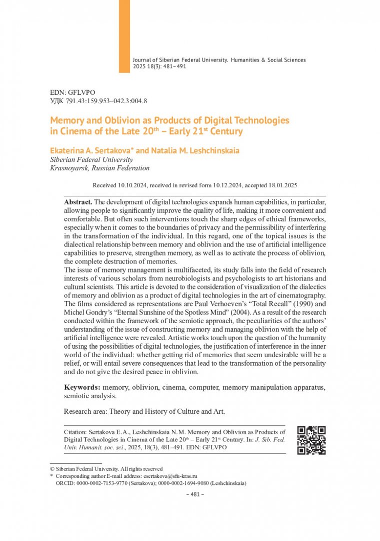 Аннотация:Данная статья посвящена рассмотрению визуализации диалектики памяти и забвения как продукта цифровых технологий в искусстве кинематографа. В качестве репрезентантов были рассмотрены фильмы: "Вспомнить все" (1990) Пола Верховена и "Вечное сияние чистого разума" (2004) Мишеля Гондри.