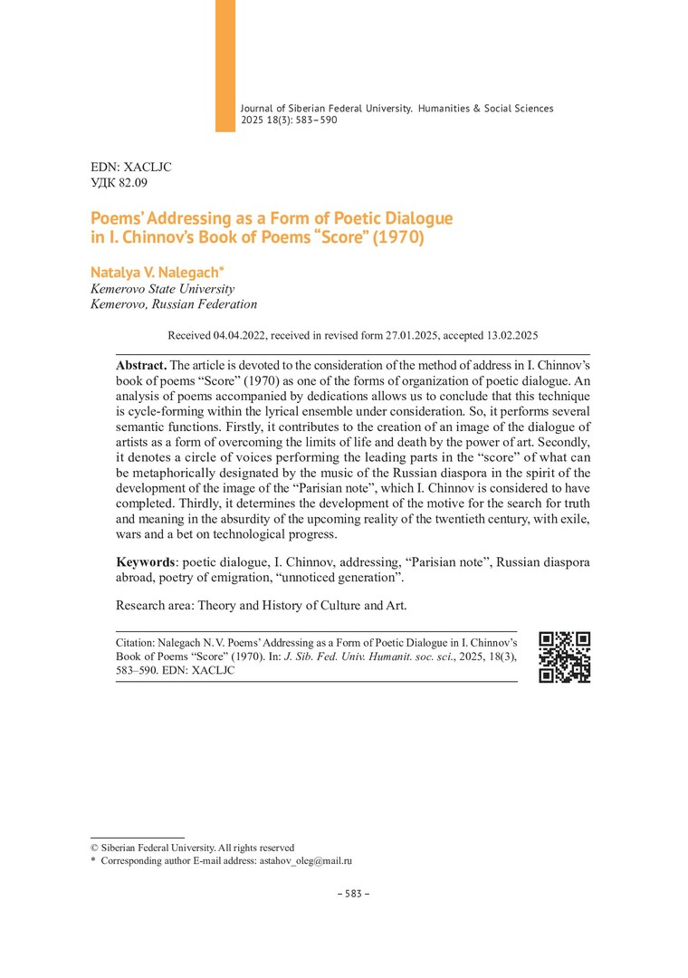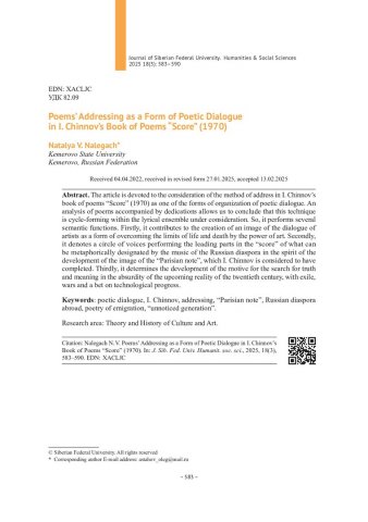 Библиографическое описание:Налегач, Н. В. Адресация стихотворений как форма поэтического диалога в книге стихов И. Чиннова "Партитура" (1970) = Poems` Addressing as a Form of Poetic Dialogue in I. Chinnov`s Book of Poems "Score" (1970) / Н. В. Налегач. - Текст : непосредственный // Журнал Сибирского федерального университета. Гуманитарные науки. - 2025. - Т. 18, № 3. - С. 583-590. - Библиогр.: с. 589-590. - ISSN 1997-1370.