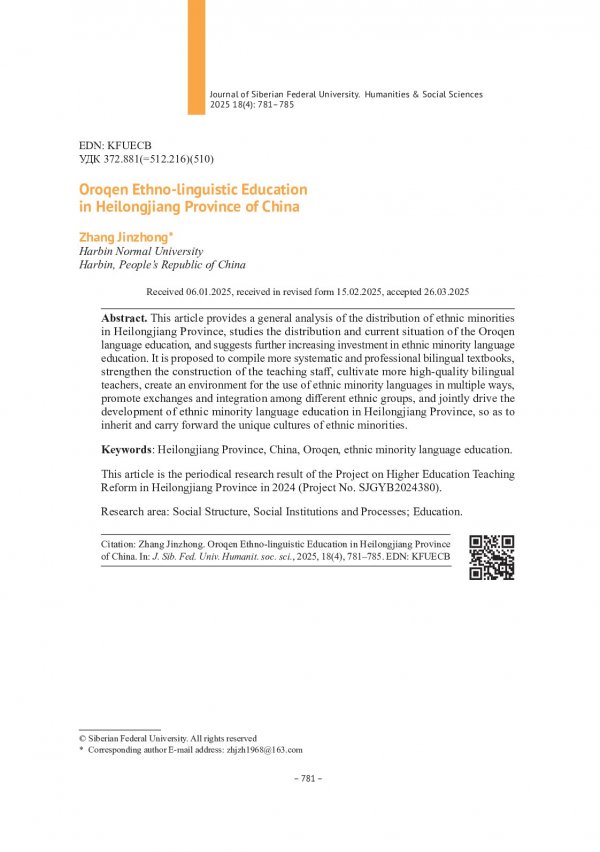 Библиографическое описание:Zhang Jinzhong. Oroqen Ethno- linguistic Education in Heilongjiang Province of China = Этнолингвистическое образование орочон в провинции Хэйлунцзян Китая / Zhang Jinzhong. - Текст : непосредственный // Журнал Сибирского федерального университета. Гуманитарные науки. - 2025. - Т. 18, № 4. - С. 781-785. - Библиогр.: с. 785. - ISSN 1997-1370.