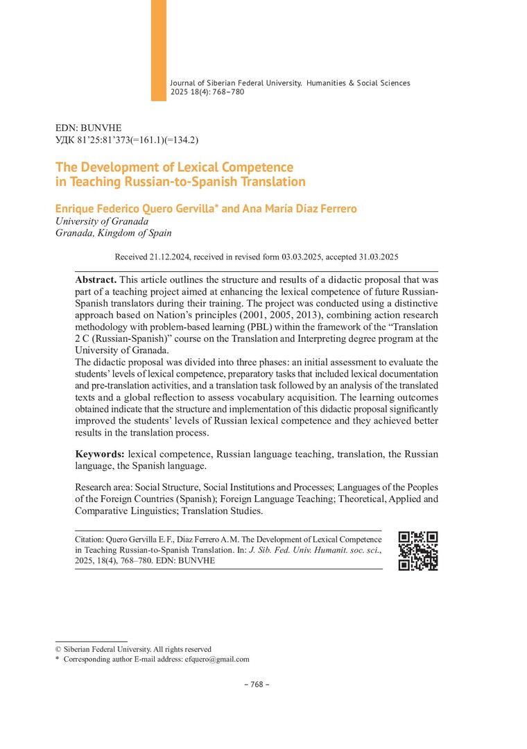 Библиографическое описание:Enrique Federico Quero Gervilla. The Development of Lexical Competence in Teaching Russian- to- Spanish Translation = Развитие лексической компетенции в обучении переводу с русского на испанский / Enrique Federico Quero Gervilla, Ana María Díaz Ferrero. - Текст : непосредственный // Журнал Сибирского федерального университета. Гуманитарные науки. - 2025. - Т. 18, № 4. - С. 768-780. - Библиогр.: с. 778-780. - ISSN 1997-1370.