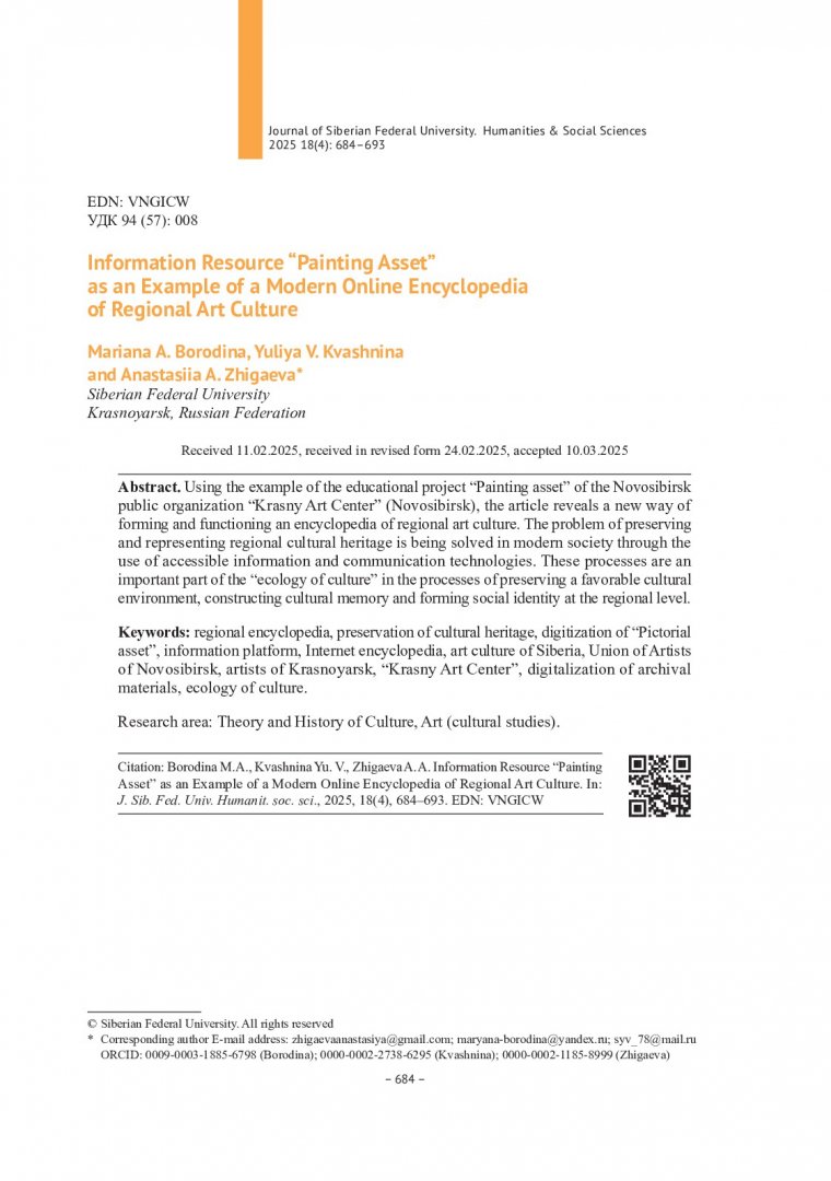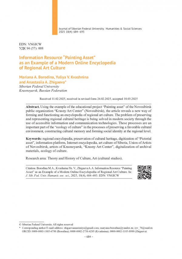 Библиографическое описание:Бородина, М. А. Информационный ресурс "Живописный актив" как пример современной интернет-энциклопедии региональной художественной культуры = Information Resource "Painting Asset" as an Example of a Modern Online Encyclopedia of Regional Art Culture / М. А. Бородина, Ю. В. Квашнина, А. А. Жигаева. - Текст : непосредственный // Журнал Сибирского федерального университета. Гуманитарные науки. - 2025. - Т. 18, № 4. - С. 684-693. - Библиогр.: с. 691-693. - ISSN 1997-1370.