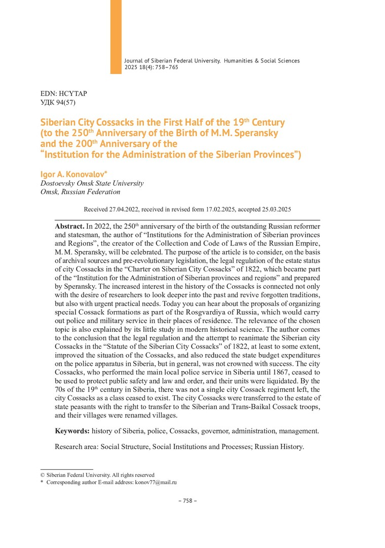Библиографическое описание:Konovalov, Igor. Siberian City Cossacks in the First Half of the 19th Century (to the 250th Anniversary of the Birth of M. M. Speransky and the 200th Anniversary of the “Institution for the Administration of the Siberian Provinces”) = Сибирские городовые казаки в первой половине XIX века (к 250-летию со дня рождения М. М. Сперанского и 200-летию "Учреждения для управления сибирских губерний") / I. A. Konovalov. - Текст : непосредственный // Журнал Сибирского федерального университета. Гуманитарные науки. - 2025. - Т. 18, № 4. - С. 758-765. - Библиогр.: с. 764-765. - ISSN 1997-1370.