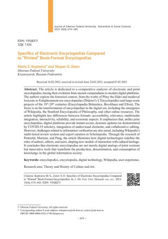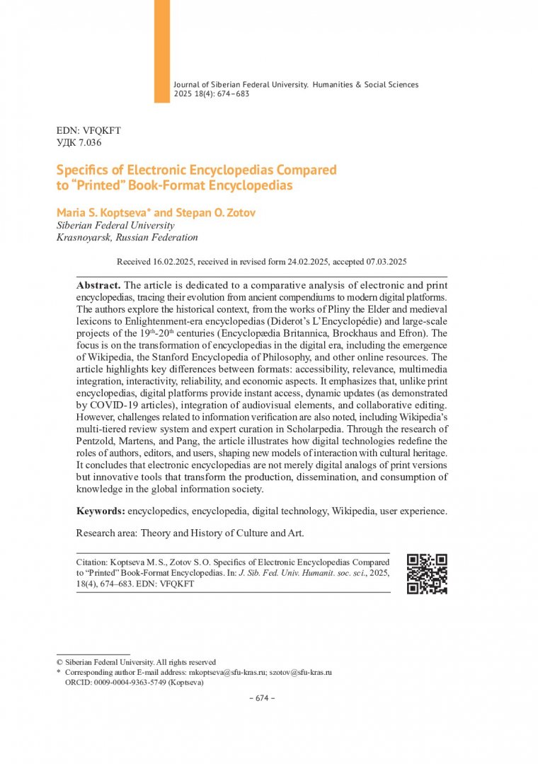 Библиографическое описание:Копцева, М. С. Специфика электронных энциклопедий по сравнению с "печатными" энциклопедиями книжного формата = Specifics of Electronic Encyclopedias Compared to "Printed" Book-Format Encyclopedias / М. С. Копцева, С. О. Зотов. - Текст : непосредственный // Журнал Сибирского федерального университета. Гуманитарные науки. - 2025. - Т. 18, № 4. - С. 674-683. - Библиогр.: с. 682-683. - ISSN 1997-1370.