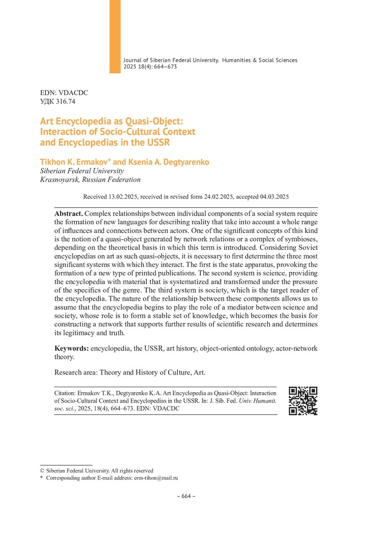 Библиографическое описание:Ермаков, Т. К. Энциклопедия искусства как квазиобъект: взаимодействие социально-культурного контекста и энциклопедий в СССР = Art Encyclopedia as Quasi-Object: Interaction of Socio-Cultural Context and Encyclopedias in the USSR / Т. К. Ермаков, К. А. Дегтяренко. - Текст : непосредственный // Журнал Сибирского федерального университета. Гуманитарные науки. - 2025. - Т. 18, № 4. - С. 664-673. - Библиогр.: с. 671-673. - ISSN 1997-1370.