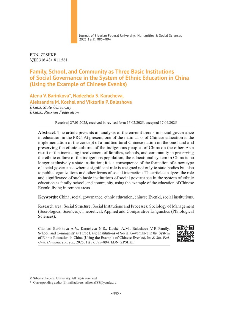 Библиографическое описание:Family, School, and Community as Three Basic Institutions of Social Governance in the System of Ethnic Education in China (Using the Example of Chinese Evenks) = Семья, школа и социум как три базовых института социального управления системой этнического образования в КНР на примере китайских эвенков / A. V. Barinkova, N. S. Karacheva, A. M. Koshel, V. P. Balashova. - Текст : непосредственный // Журнал Сибирского федерального университета. Гуманитарные науки. - 2025. - Т. 18, № 5. - С. 885-894. - Библиогр.: с. 893-894. - ISSN 1997-1370.