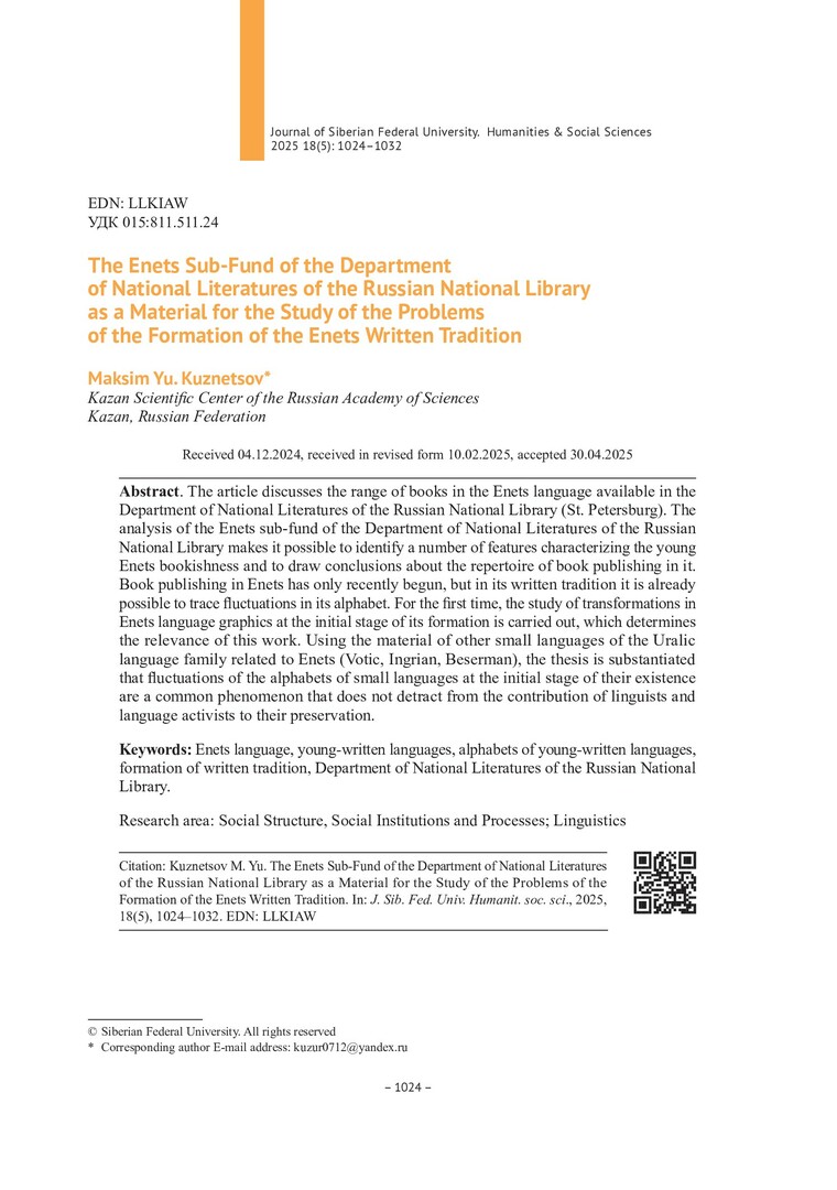 Библиографическое описание:Кузнецов, М. Ю. Энецкий подфонд Отдела национальных литератур Российской национальной библиотеки как материал для исследования проблем становления энецкой письменной традиции = The Enets Sub-Fund of the Department of National Literatures of the Russian National Library as a Material for the Study of the Problems of the Formation of the Enets Written Tradition / М. Ю. Кузнецов. - Текст : непосредственный // Журнал Сибирского федерального университета. Гуманитарные науки. - 2025. - Т. 18, № 5. - С. 1024-1032. - Библиогр.: с. 1031-1032. - ISSN 1997-1370.