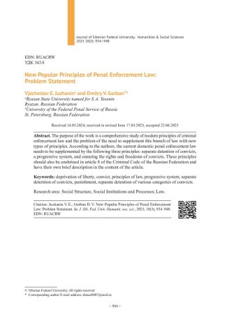 Библиографическое описание:Juzhanin, Vjacheslav. New Popular Principles of Penal Enforcement Law: Problem Statement = Новые востребованные принципы уголовно-исполнительного права: постановка проблемы / V. E. Juzhanin, D. V. Gorban. - Текст : непосредственный // Журнал Сибирского федерального университета. Гуманитарные науки. - 2025. - Т. 18, № 5. - С. 934-948. - Библиогр.: с. 947-948. - ISSN 1997-1370.