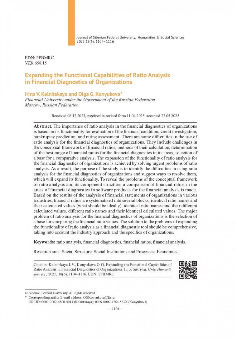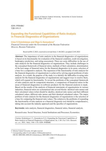 Библиографическое описание:Кальницкая, И. В. Расширение функциональных возможностей коэффициентного анализа в финансовой диагностике организаций = Expanding the Functional Capabilities of Ratio Analysis in Financial Diagnostics of Organizations / И. В. Кальницкая, О. Г. Конюкова. - Текст : непосредственный // Журнал Сибирского федерального университета. Гуманитарные науки. - 2025. - Т. 18, № 6. - С. 1104-1116. - Библиогр.: с. 1115-1116. - ISSN 1997-1370.