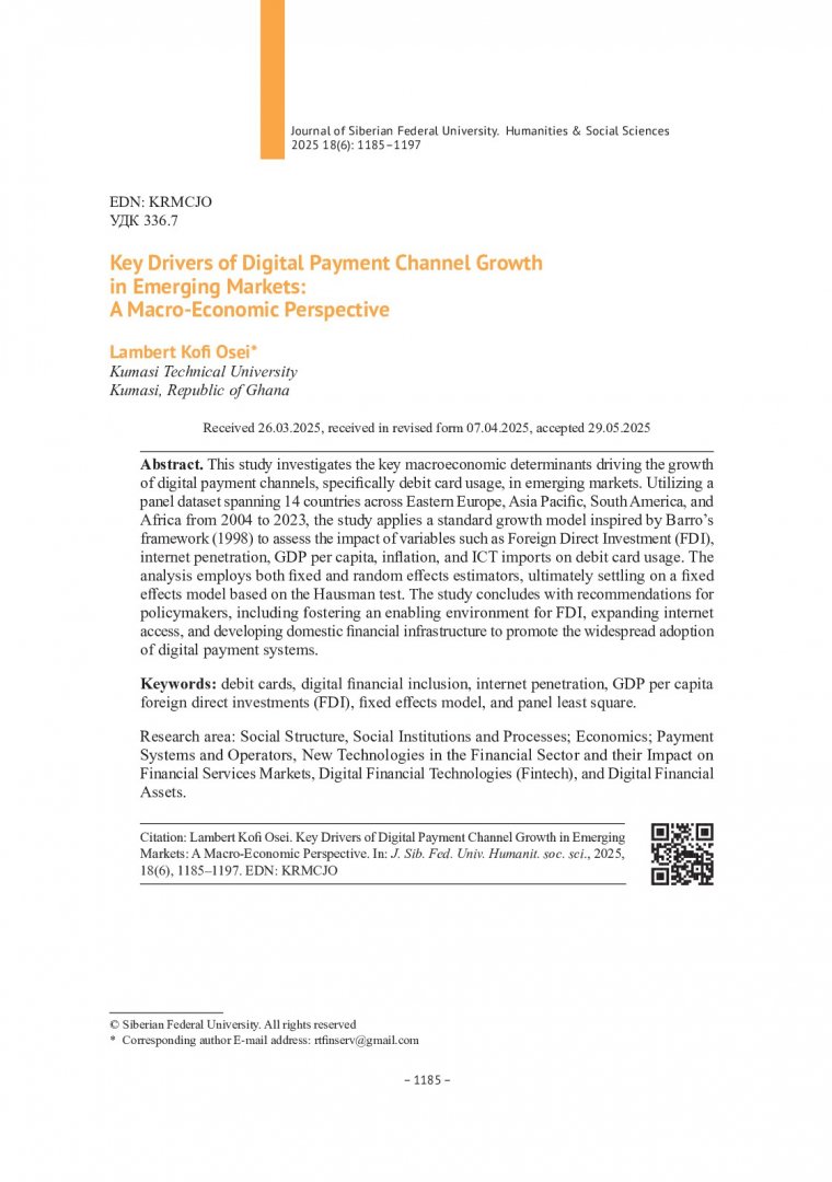Библиографическое описание:Lambert Kofi Osei. Key Drivers of Digital Payment Channel Growth in Emerging Markets: A Macro-Economic Perspective = Ключевые факторы роста цифровых платежных каналов на развивающихся рынках: макроэкономический подход / Lambert Kofi Osei. - Текст : непосредственный // Журнал Сибирского федерального университета. Гуманитарные науки. - 2025. - Т. 18, № 6. - С. 1185-1197. - Библиогр.: с. 1196-1197. - ISSN 1997-1370.
