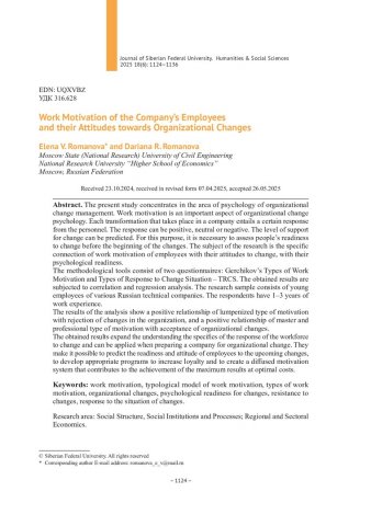 Библиографическое описание:Романова, Е. В. Трудовая мотивация сотрудников компании и их отношение к организационным изменениям = Work Motivation of the Company`s Employees and their Attitudes towards Organizational Changes / Е. В. Романова, Д. Р. Романова. - Текст : непосредственный // Журнал Сибирского федерального университета. Гуманитарные науки. - 2025. - Т. 18, № 6. - С. 1124-1136. - Библиогр.: с. 1135-1136. - ISSN 1997-1370.