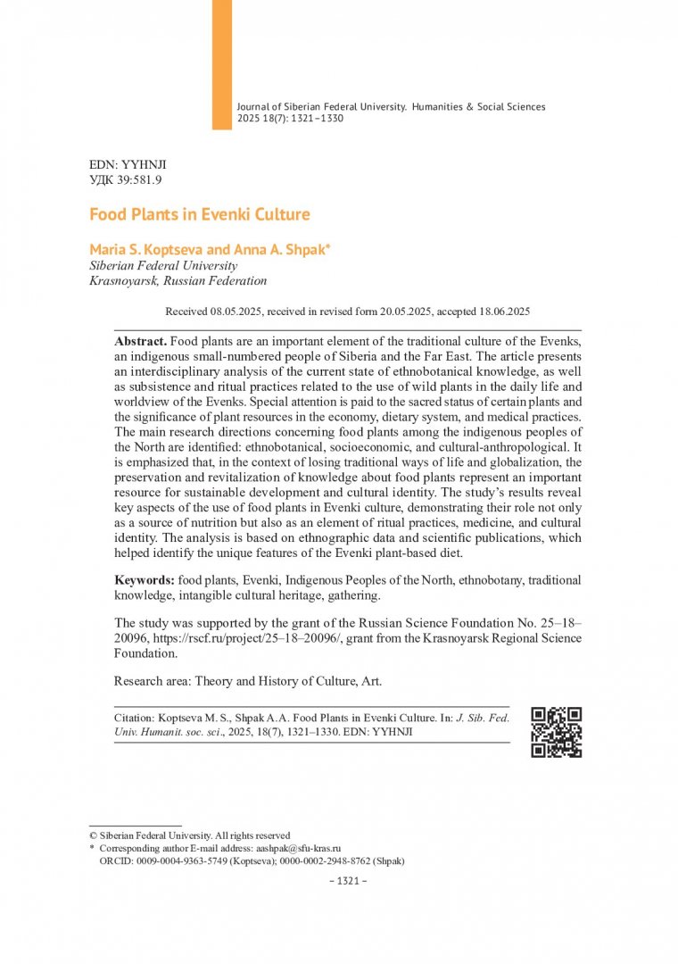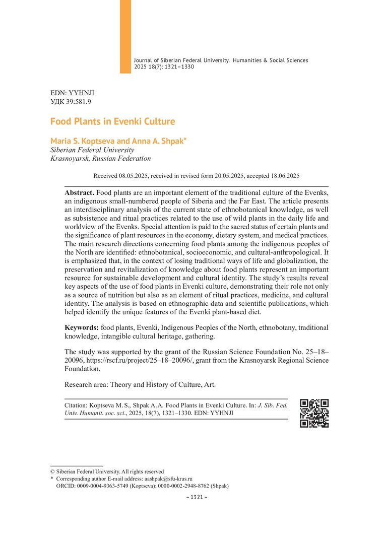 Библиографическое описание: Копцева, М. С. Пищевые растения в эвенкийской культуре = Food Plants in Evenki Culture / М. С. Копцева, А. А. Шпак. - Текст : непосредственный // Журнал Сибирского федерального университета. Гуманитарные науки. - 2025. - Т. 18, № 7. - С. 1321-1330. - Библиогр.: с. 1328-1330. - ISSN 1997-1370.