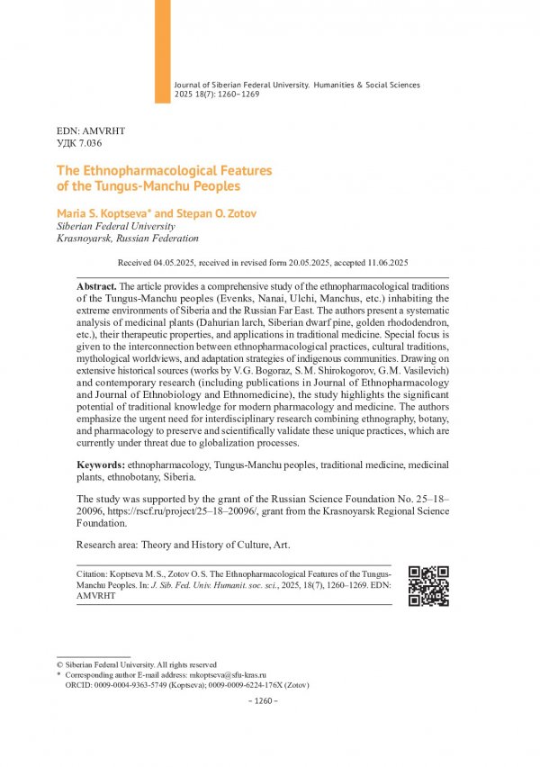 Библиографическое описание:Копцева, М. С. Особенности этнофармакологии тунгусо-маньчжурских народов = The Ethnopharmacological Features of the Tungus-Manchu Peoples / М. С. Копцева, С. О. Зотов. - Текст : непосредственный // Журнал Сибирского федерального университета. Гуманитарные науки. - 2025. - Т. 18, № 7. - С. 1260-1269. - Библиогр.: с. 1267-1269. - ISSN 1997-1370.
