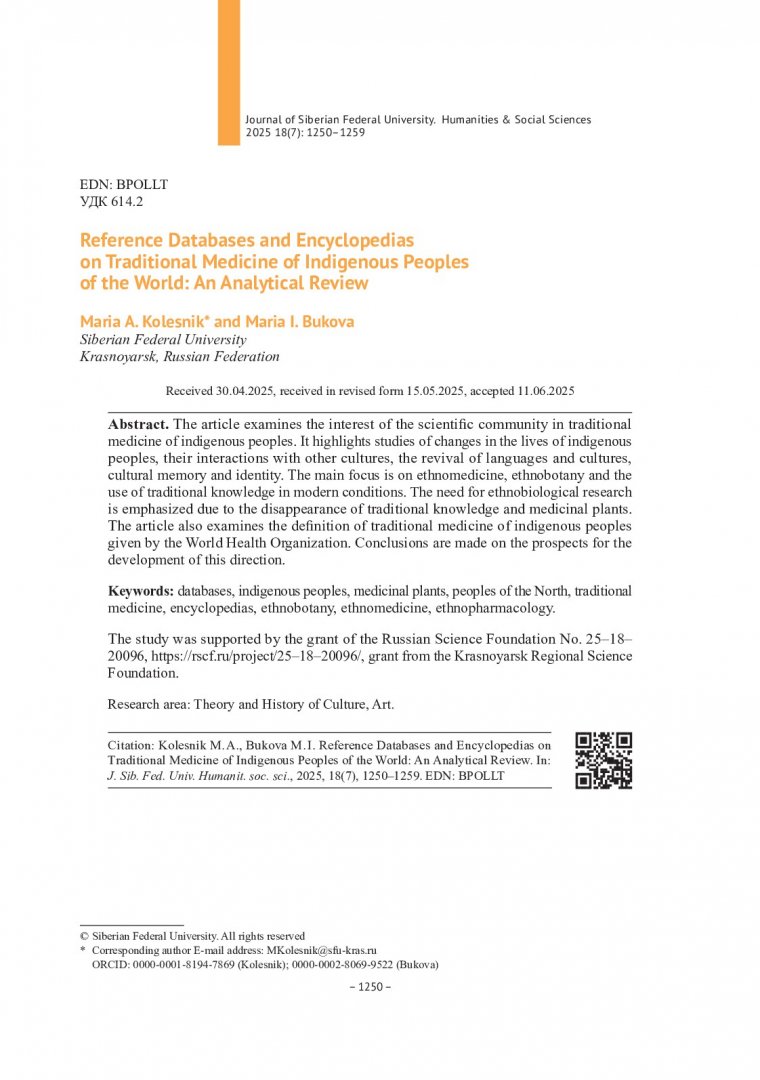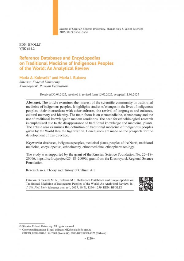 Библиографическое описание:Колесник, М. А. Справочные базы данных и энциклопедии по традиционной медицине коренных народов мира: аналитический обзор = Reference Databases and Encyclopedias on Traditional Medicine of Indigenous Peoples of the World: An Analytical Review / М. А. Колесник, М. И. Букова. - Текст : непосредственный // Журнал Сибирского федерального университета. Гуманитарные науки. - 2025. - Т. 18, № 7. - С. 1250-1259. - Библиогр.: с. 1256-1259. - ISSN 1997-1370.